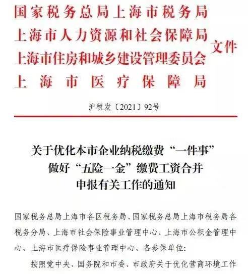 上海税务局联合人社、住建及医保部门发布《关于优化本市企业纳税缴费“一件事” 做好“五险一金”缴费工资合并申报有关工作的通知》(沪税发[2021]92号),从2021年12月31日起,优化企业五险一金缴费工资申报流程,实现合并申报、数据互认。