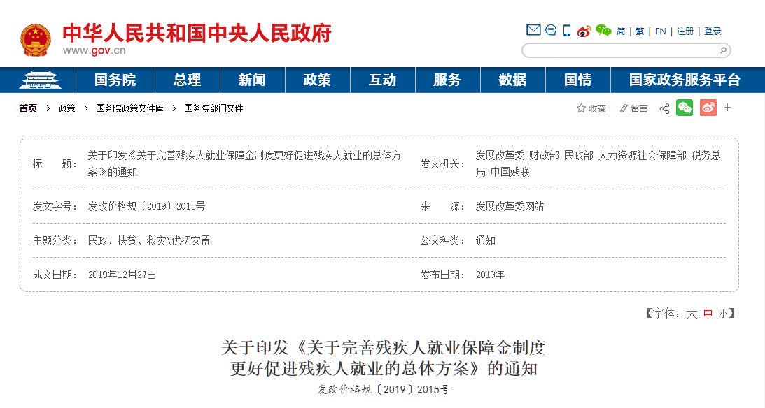 发改委等六部门印发《关于完善残疾人就业保证金制度更好促进残疾人就业的总体方案》(发改价格规[2019]2015号),明确自2020年1月1日起:对在职职工人数30人(含)以下的企业,暂免征收残保金。