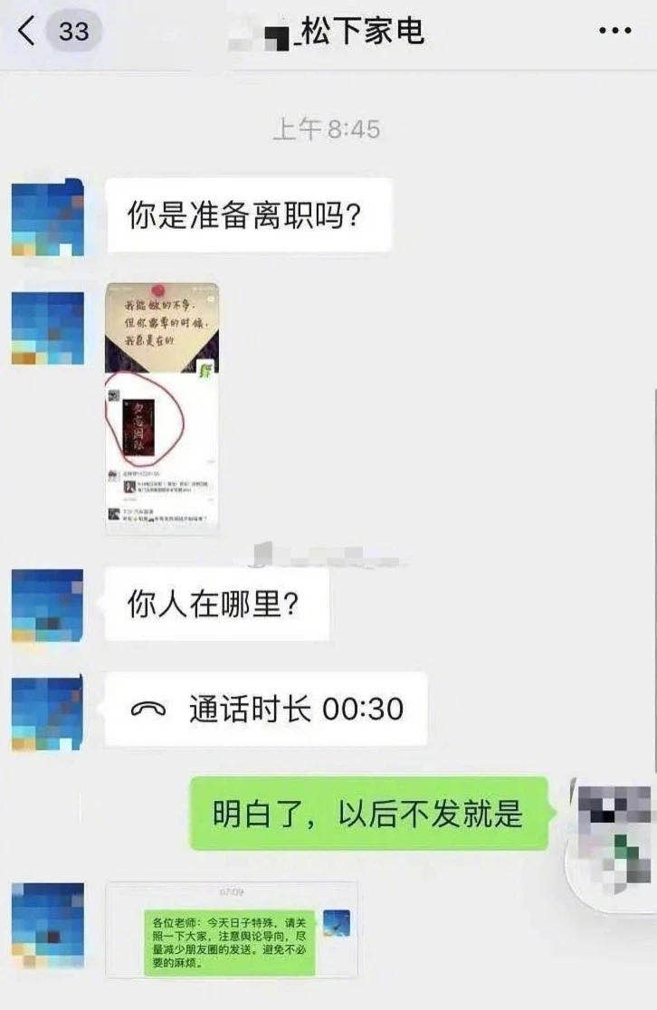 一名松下员工于9月18日当天在微信朋友圈分享“勿忘国耻”图片后,被其中国籍领导指出:“今天日子特殊,注意舆论导向,尽量减少朋友圈的发送,避免不必要的麻烦”,并称“你是准备离职吗?”