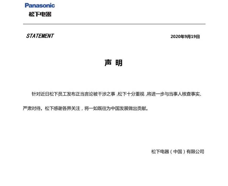 针对网传“9月18日,松下员工因发布‘勿忘国耻’被警告离职”一事,松下电器(中国)有限公司19日发布声明称:将进一步与当事人核查事实、 严肃对待。