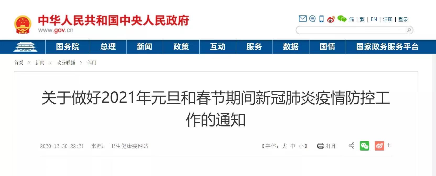 国务院联防联控机制综合组于2020年12月30日发布《关于做好2021年元旦和春节期间新冠肺炎疫情防控工作的通知》。《通知》提到,引导务工人员等在条件允许情况下留在务工地过年,指导督促用人单位依法依规做好加班工资支付和调休等工作,引导务工人员错峰返乡返岗。