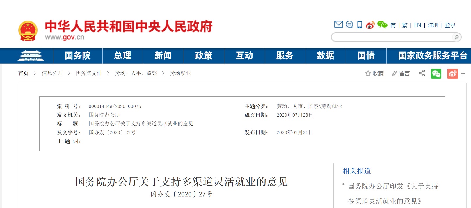 2020年7月28日,国务院办公厅印发《关于支持多渠道灵活就业的意见》(以下简称《意见》)。