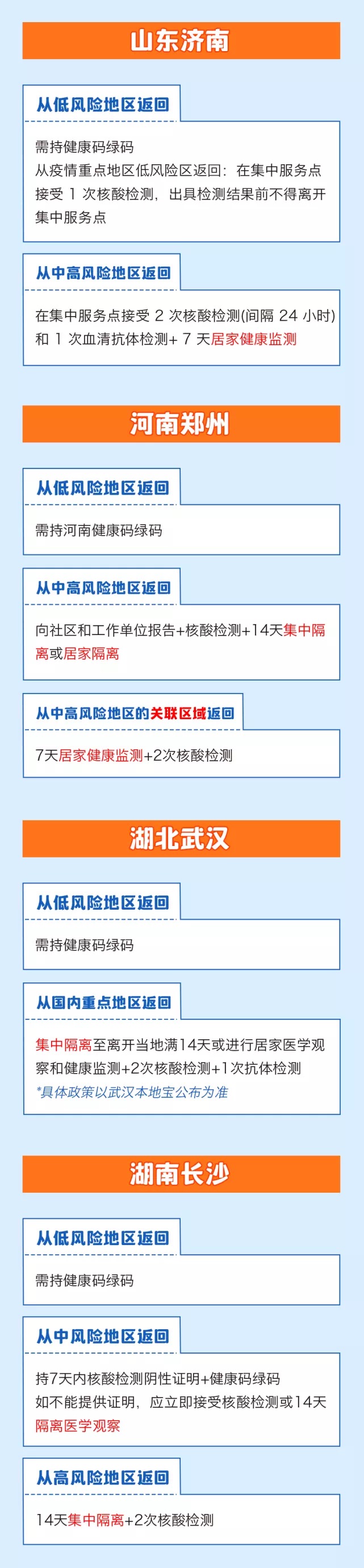 武汉市要求,全国低风险地区返汉返乡过春节的人员,包括大学生、上班族、农民工等,全部要持7天内核酸检测阴性证明,不能提供核酸检测阴性结果的,街道为其安排1次核酸检测,并进行14天的社区健康管理。