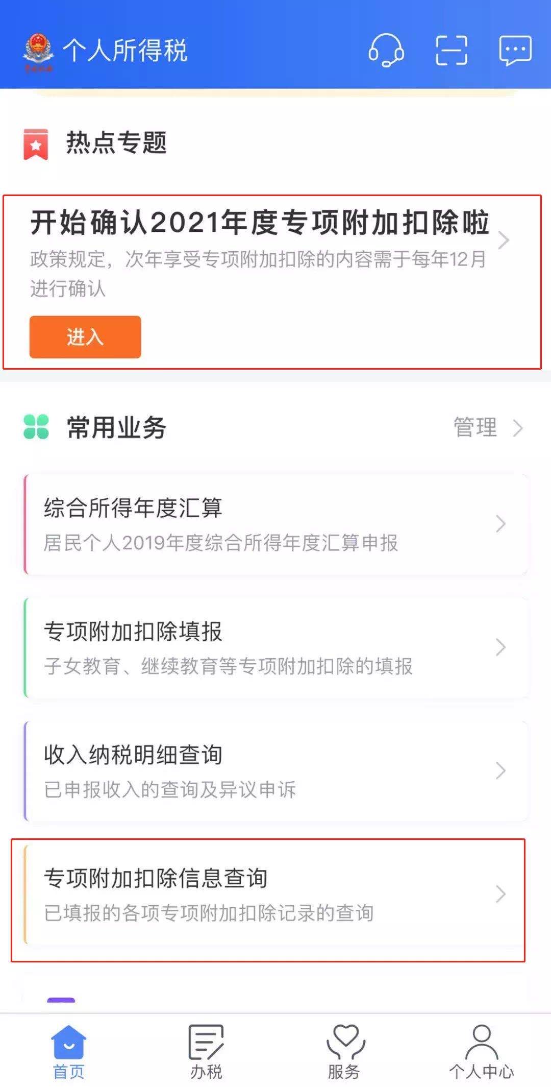 入口2:点击个人所得税APP“首页”-“专项附加扣除信息查询”进入。