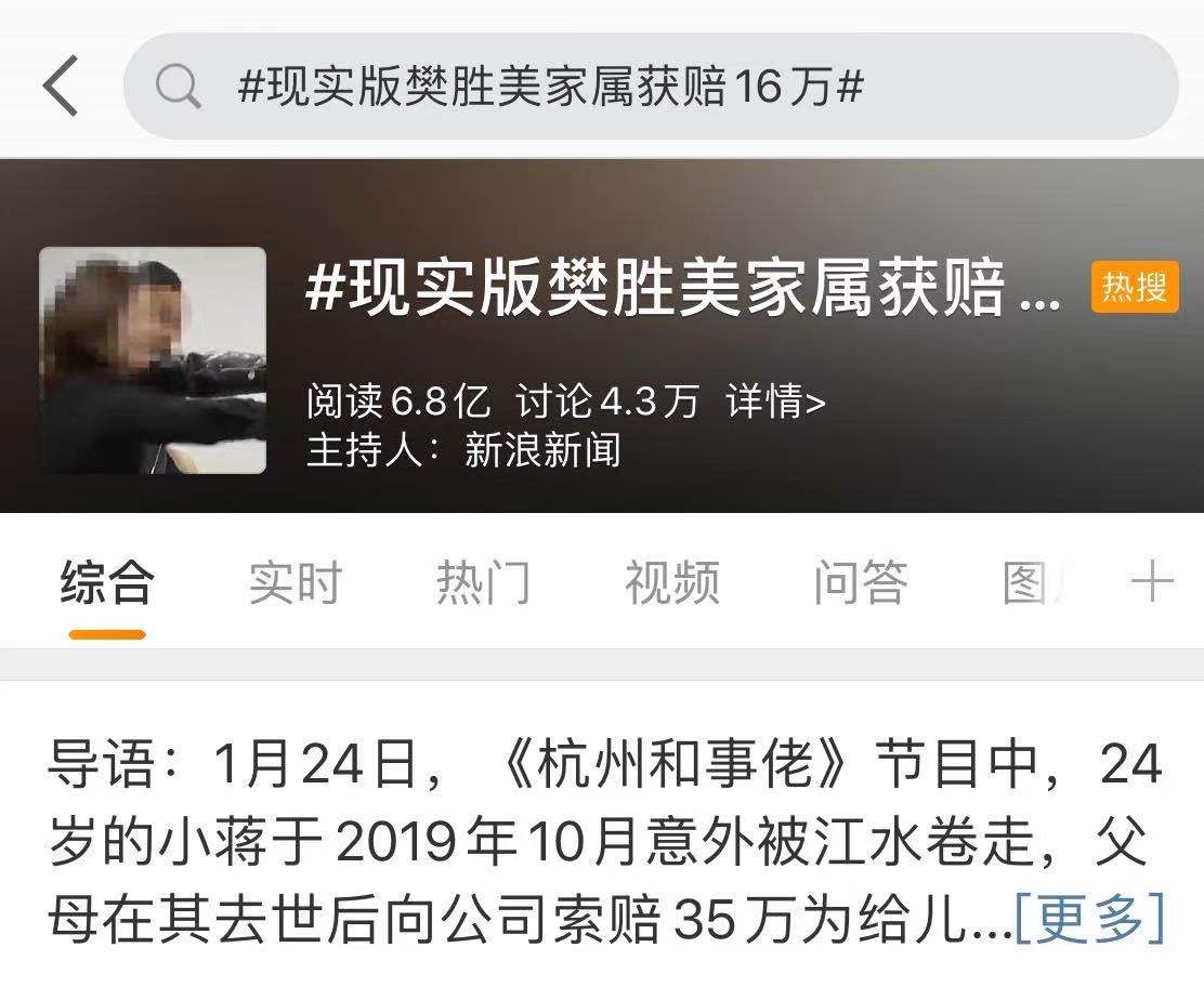 1月24日,《杭州和事佬》节目中,24岁的小蒋于2019年10月意外被江水卷走,父母在其去世后向公司索赔41万为给儿子买房,被节目称为“现实版樊胜美”。