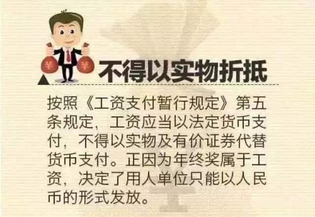 由于年终奖属于工资性质,因此年终奖的发放不能以实物抵发。
