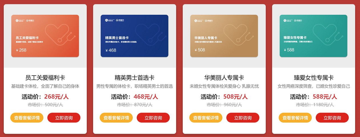 体检一般需要咨询体检医生,通过自身症状得出体检项目。但是,目前市场上的体检多是一个模子印出来的,毫无个性化。对此,微蜂网专门推出个性化定制套餐,针对员工、男性、未婚女性、已婚女性定制4种体检卡,筛选出每类人群高频体检选项,做到真正全方位体检身体!最低价268元起,机会不容错过。