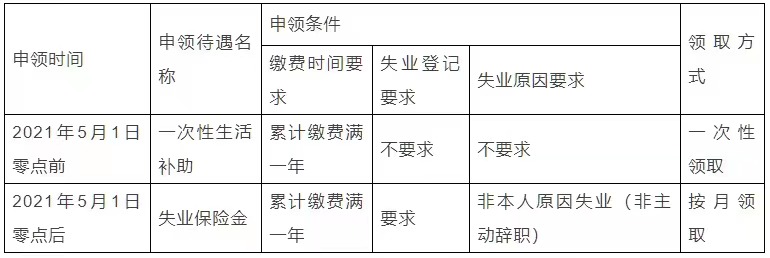 二、农民合同制工人2021年5月1日以后申领失业保险金条件与之前一次性生活补助有何不同?