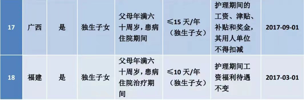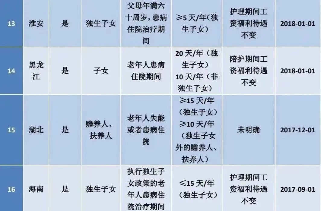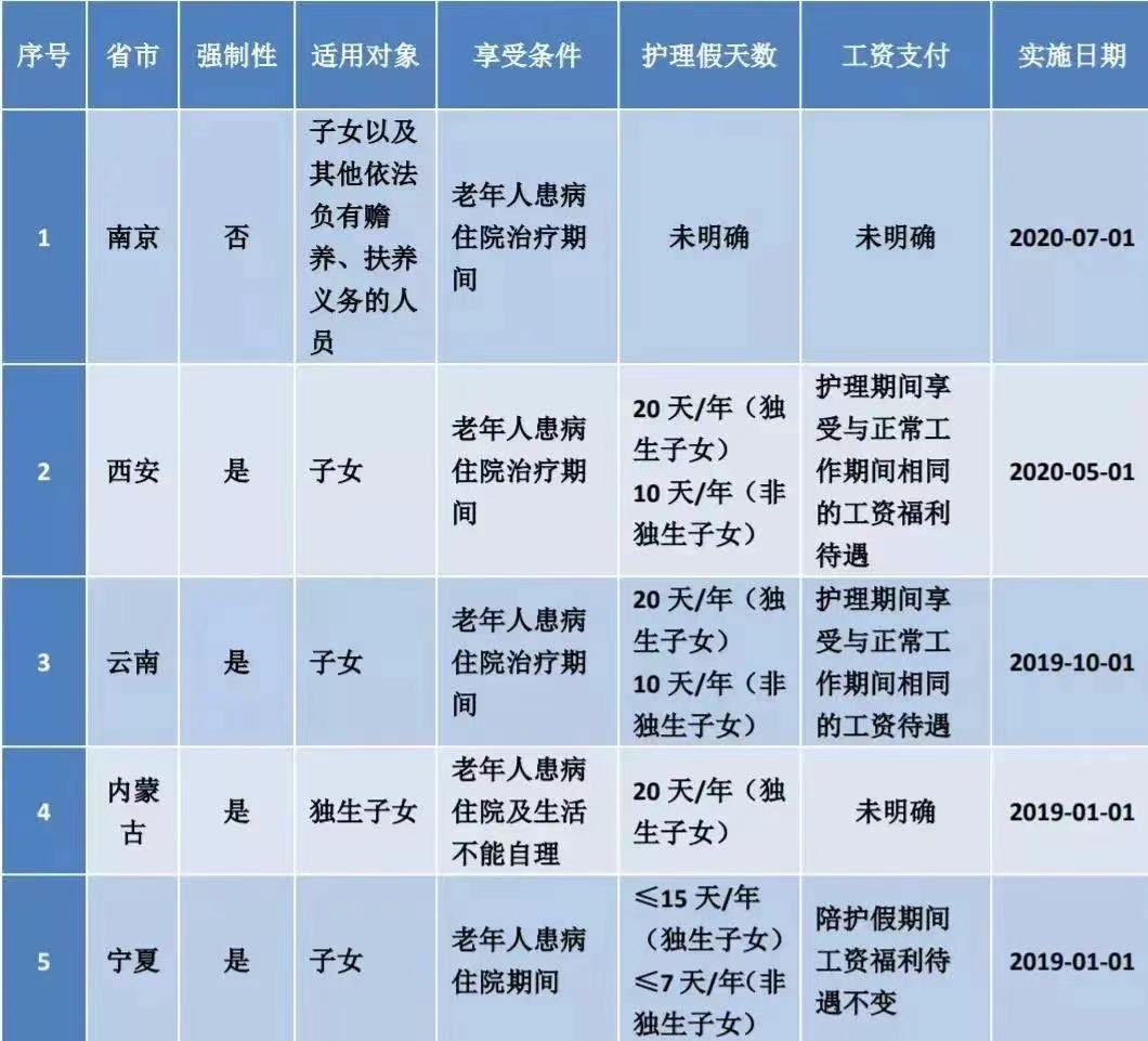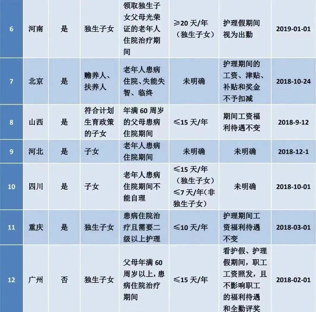 据悉,福建、广西、海南、湖北、黑龙江、淮安、广州、重庆、四川、河北、山西、北京、河南、宁夏、内蒙古、云南、西安、南京等多地出台了“独生子女护理假”相关的具体规定