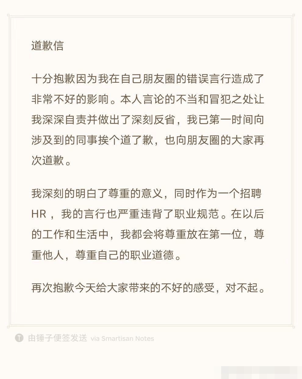 同时,他还称作为HR,自己的言行违背了职业规范,以后会将尊重放在第一位。
