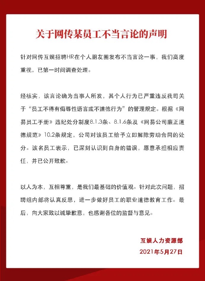 27日,网易互娱人力资源部向新浪科技等行业媒体发出声明:经核实,该言论确为当事人所发,其个人行为已经严重违反我司关于“员工不得有侮辱性语言或不道德行为”的管理规定。