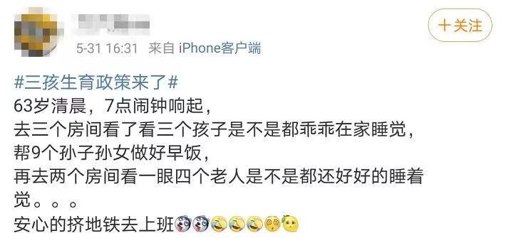 网友A:一对夫妻生3个孩子,要养4个老人,晚年还得看9个孙子……画面感太强,没忍住笑出了声