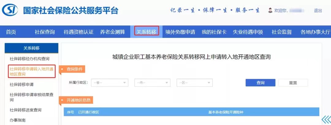 ②先查询转入地是否开通了网上申请业务。选择菜单栏中的“关系转移”,点击“社保转移申请转入地开通地区查询”,输入相关信息即可。
