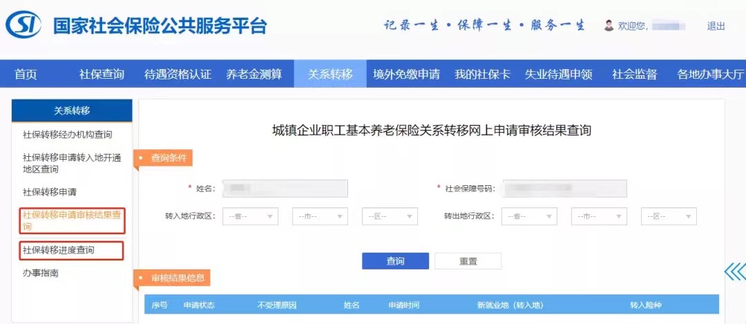 申请之后,就是等待审核结果了,可以通过左侧的“社保转移申请审核结果查询”和“社保转移进度查询”随时查看办理进度及受理结果。