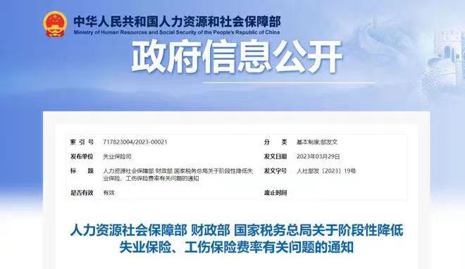 3月29日,人社部、财政部和税务部联合发布《关于阶段性降低失业保险、工伤保险费率有关问题的通知》,明确自2023年5月1日起,继续实施阶段性降低失业保险费率至1%的政策,继续实施阶段性降低工伤保险费率政策,实施期限延长至2024年底。