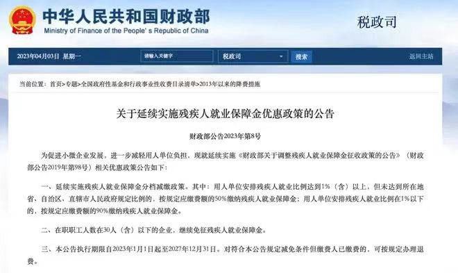 3月26日,财政部发布《关于延续实施残疾人就业保障金优惠政策的公告》,明确延续实施残疾人就业保障金分档减缴政策至2027年底!