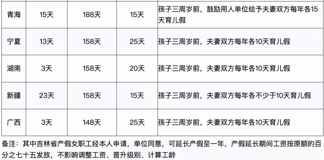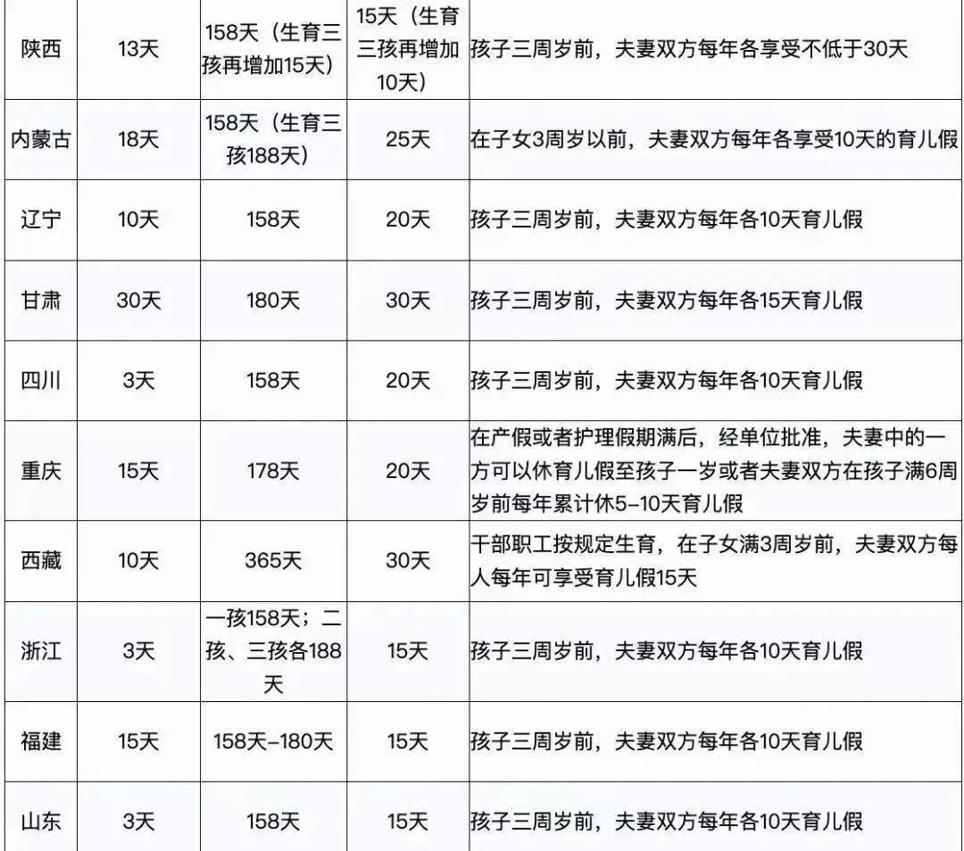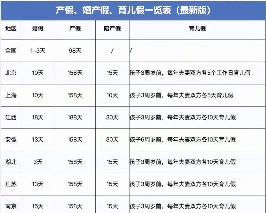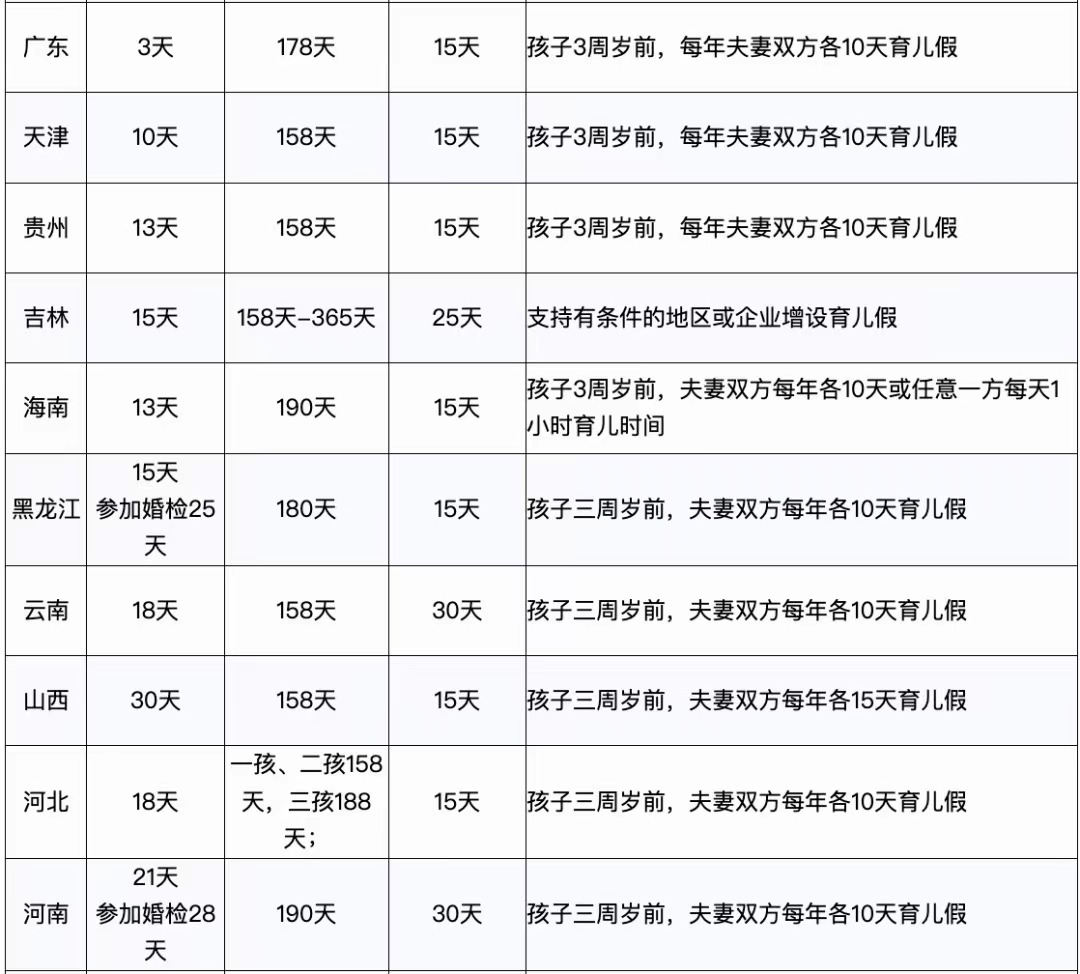 三孩政策明确后,各省市陆续修改了计划生育条例,婚假、产假、陪产假、育儿假都有了明显变化。