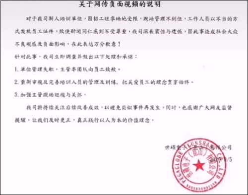 与员工回应相反,这次他们承认了这件事,但认为这件事是“招工旺季场地受限导致的,现场管理不到位”导致的。