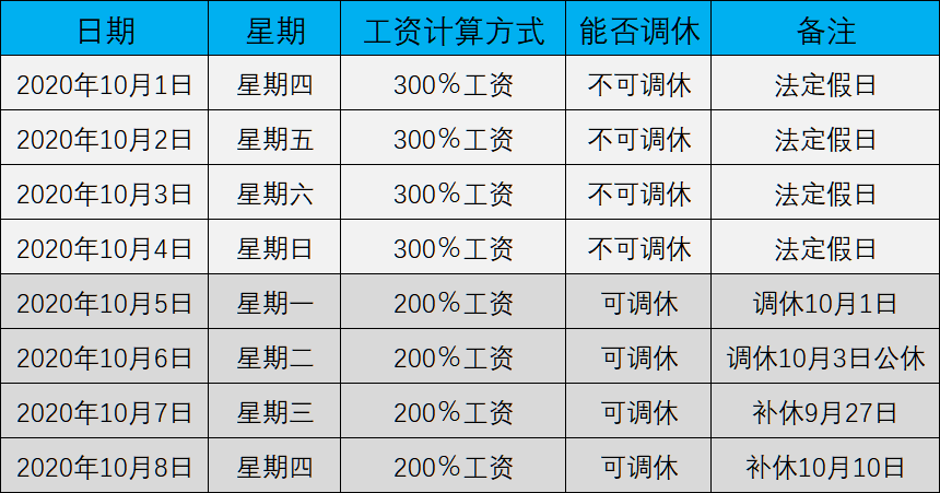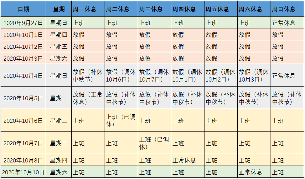 说明:10月1-3日法定节假日,4日补休10月1日,5日调休中秋节。另外,10月6日、7日正常上班,8日正常休息。