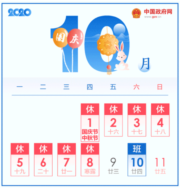 这也意味着2020年国庆法定假日是从10月1日至10月4日,而不是1-3日,也就是说今年10月全勤天数是+4,而不是往年那样+3了。