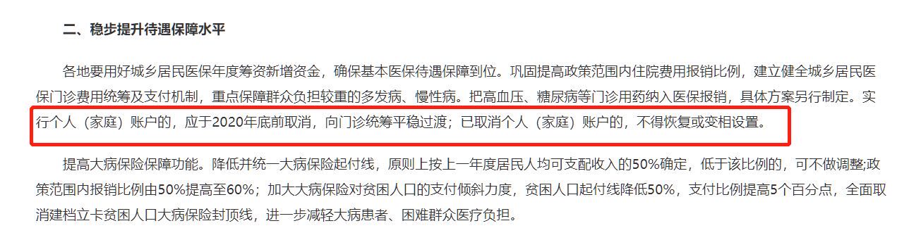 实行个人(家庭)账户的,应于2020年底前取消,向门诊统筹平稳过渡;已取消个人(家庭)账户的,不得恢复或变相设置。