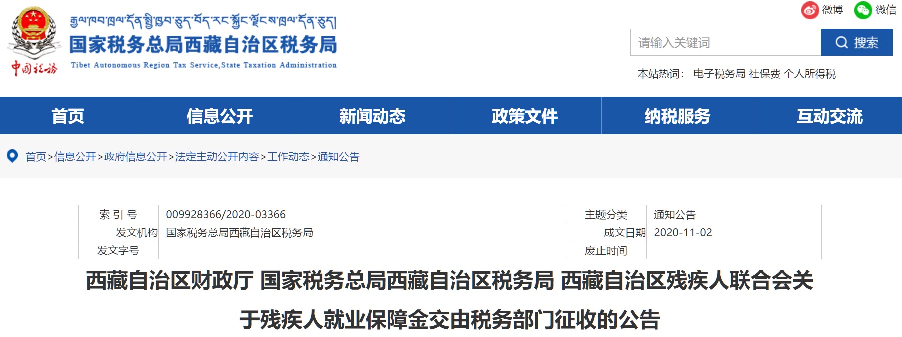 根据《财政部 国家税务总局 中国残疾人联合会关于印发〈残疾人就业保障金征收使用管理办法〉的通知》(财税〔2015〕72号)和西藏自治区人民政府关于非税收入征管职责划转工作的有关精神,自2021年1月1日起,西藏自治区范围内残疾人就业保障金交由税务部门征收。