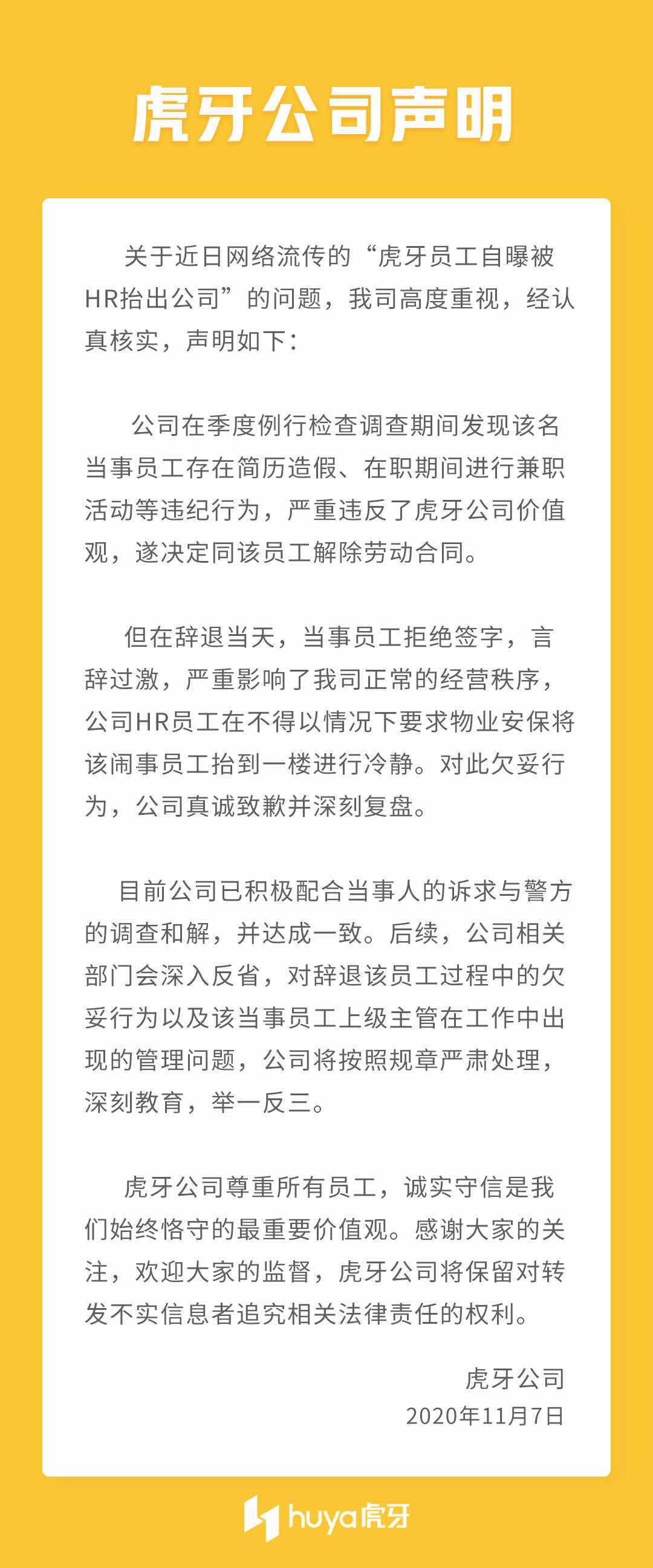 面对舆论,虎牙方面在11月7日下午发布声明,称公司在季度例行检查调查期间发现该名当事员工存在简历造假、在职期间进行兼职活动等违纪行为,严重违反了虎牙公司价值观,遂决定同该员工解除劳动合同。