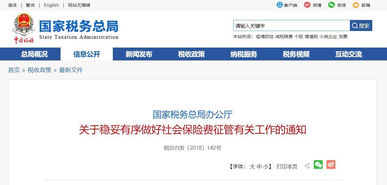 《国家税务总局办公厅关于稳妥有序做好社会保险费征管有关工作的通知》(税总办发[2018]142号)