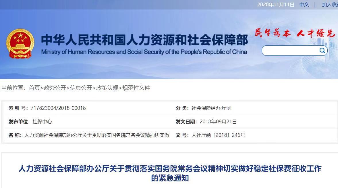 《人力资源社会保障部办公厅关于贯彻落实国务院常务会议精神切实做好稳定社保费征收工作的紧急通知》(人社厅函[2018]246号 ):