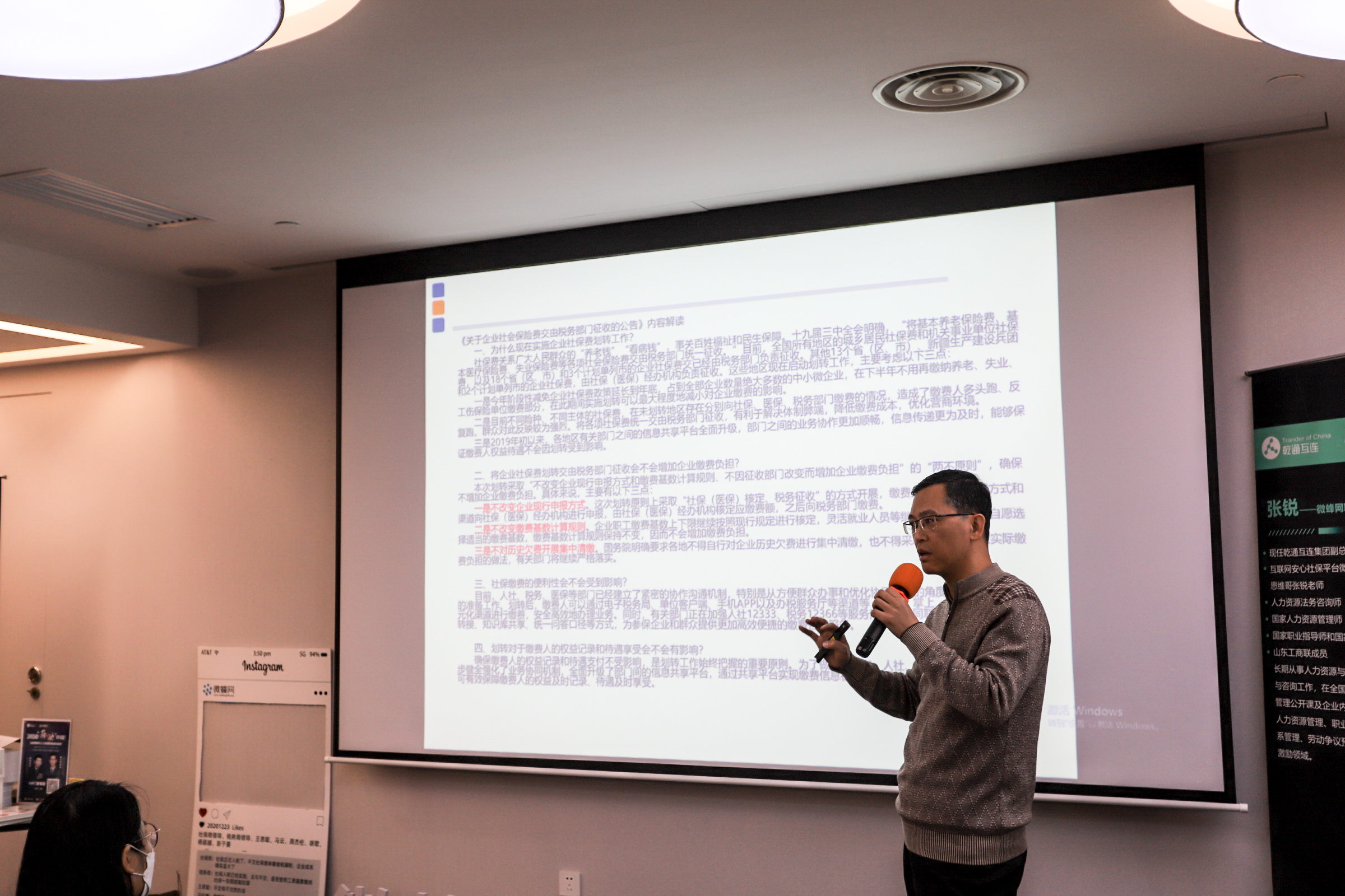 1点半,活动正式开始。上半场由思维哥张锐老师分享灵活用工趋势与风险控制。内容围绕灵活经济出发,从政、企、民三个角度谈就业减负新思路,并从身份、财税、风险角度谈灵活经济的管理问题,最终分享财税政策对于灵活经济的影响前瞻,教会HR们在灵活经济下,如何做好财税管理和风险控制。